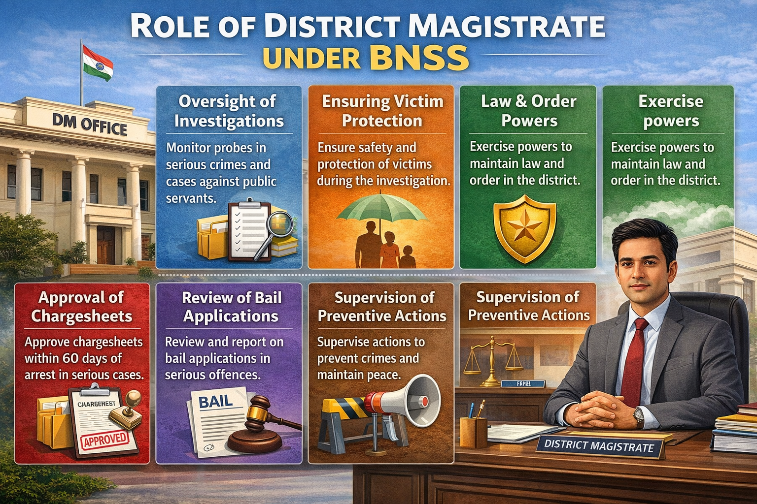 The District Magistrate under BNSS holds a central position among Executive Magistrates. The DM is responsible for: