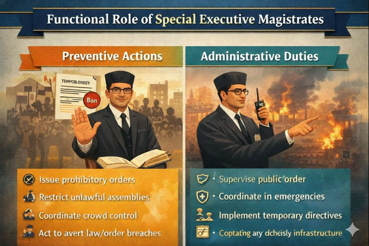 In the event of sudden communal tensions, natural disasters, or civil unrest, a Special Executive Magistrate may be deployed to lead a focused response, ensuring: