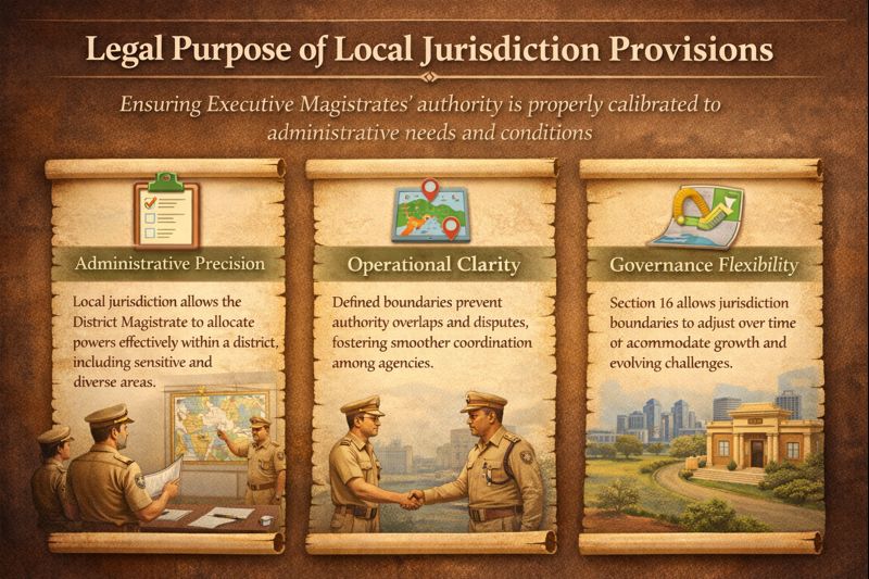 The concept of local jurisdiction ensures that Executive Magistrates’ authority is properly calibrated to administrative needs and local conditions. It mirrors similar provisions in the CrPC — specifically Section 22 of the old CrPC, which regulated local limits for executive authority.