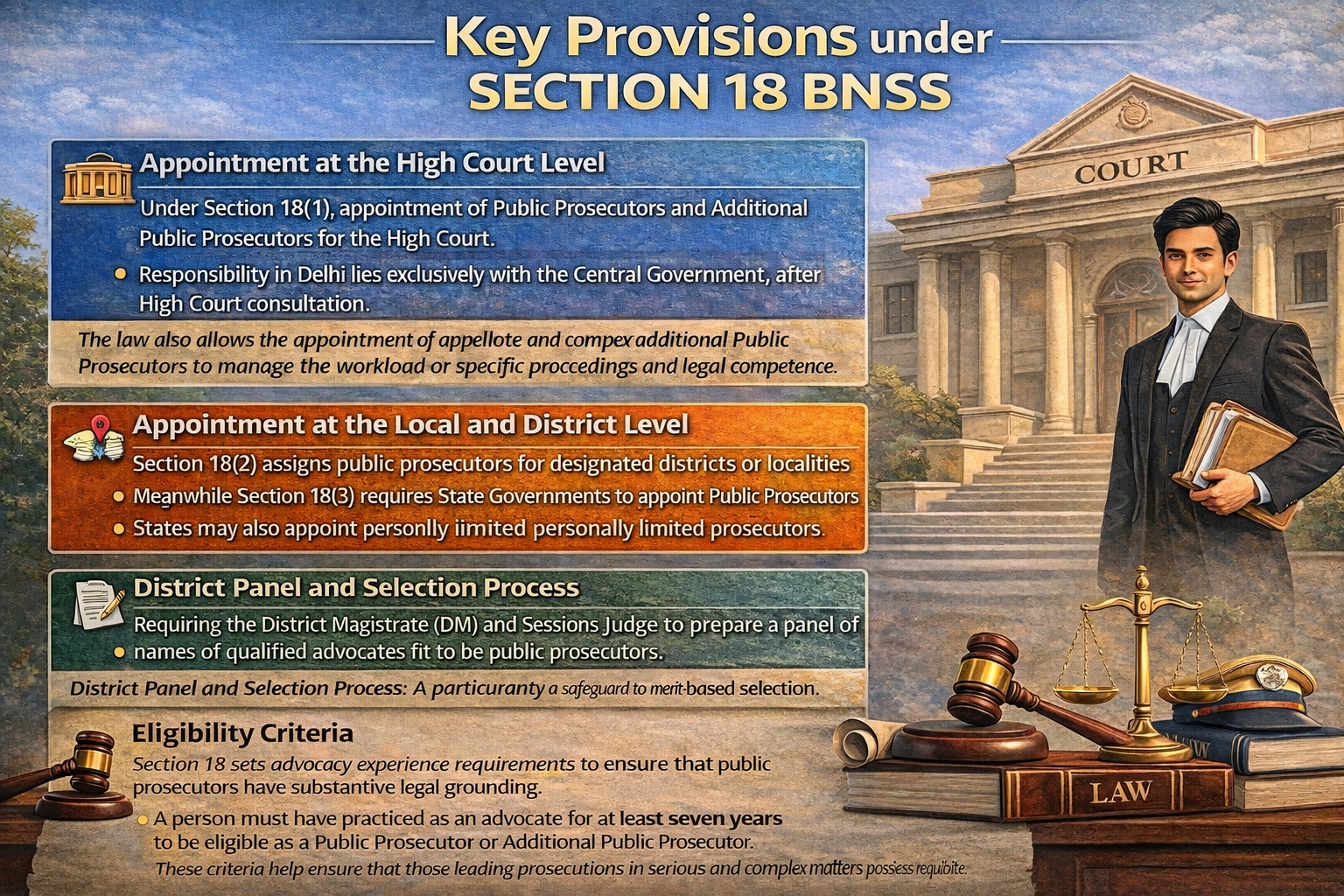 Section 18 of the Bharatiya Nagarik Suraksha Sanhita, 2023 is titled “Public Prosecutors.” It regulates the appointment and functioning of public prosecutors at the High Court, district, and local levels. The provision recognizes the need for legally qualified, experienced advocates to represent the State in criminal adjudication, appeal proceedings, and other legal forums specified under BNSS.
