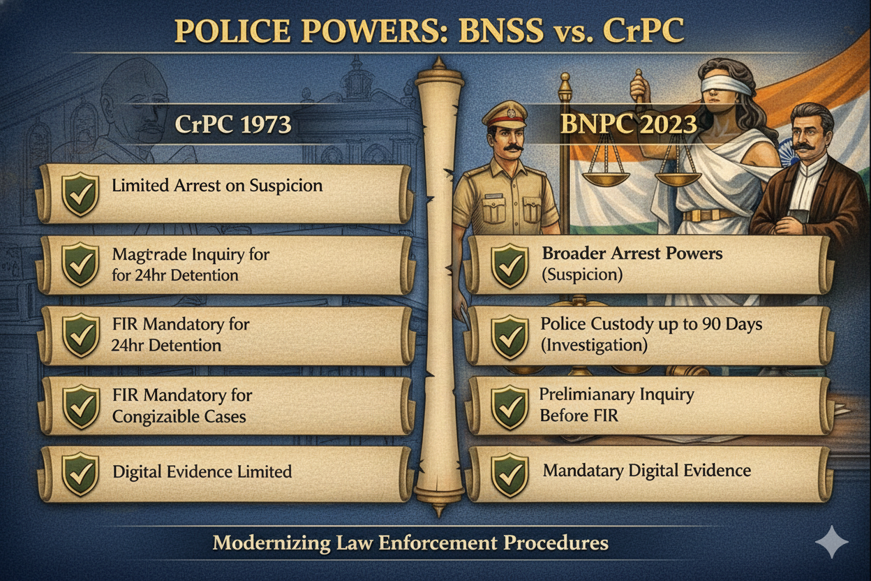One of the most debated aspects of CrPC vs BNSS concerns police authority. While police retain investigative powers, police powers under BNSS are now subject to stricter judicial supervision.